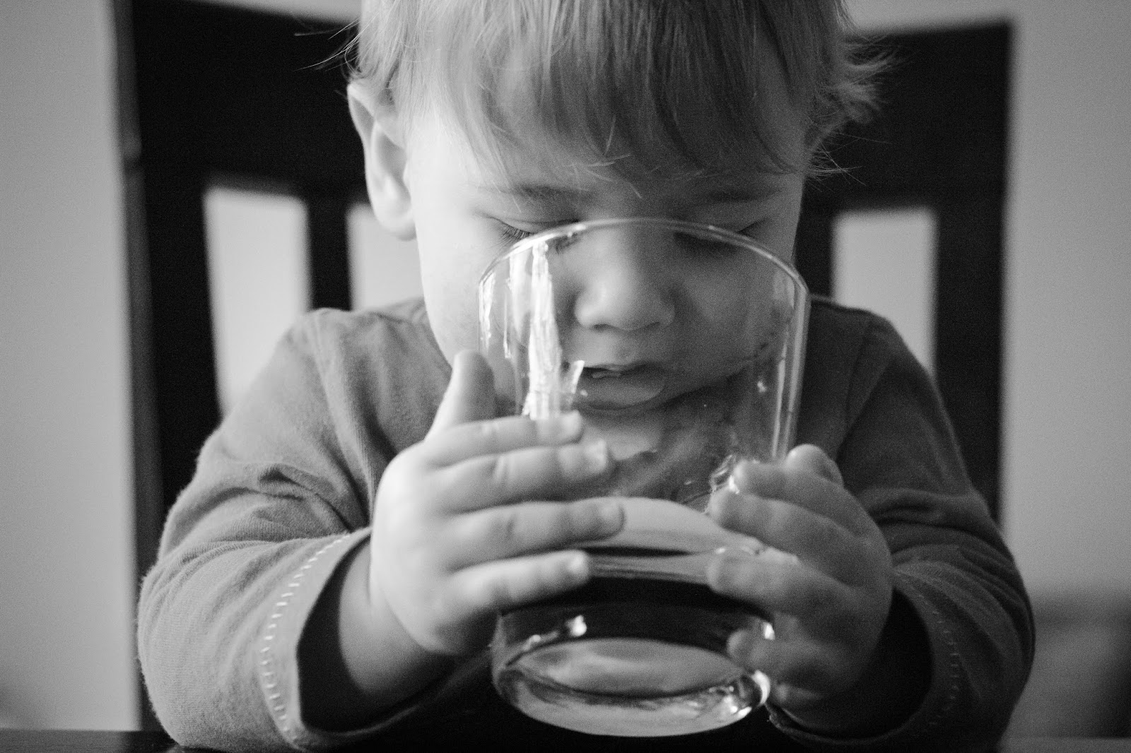 If we leave the chairs pulled out, Baby A is now able to climb up to the table. For whatever reason, he loves to sneak sips from my water. I suppose its probably just the novelty of a clear glass rather than a sippy cup...oh..and the entertainment that is ice.
